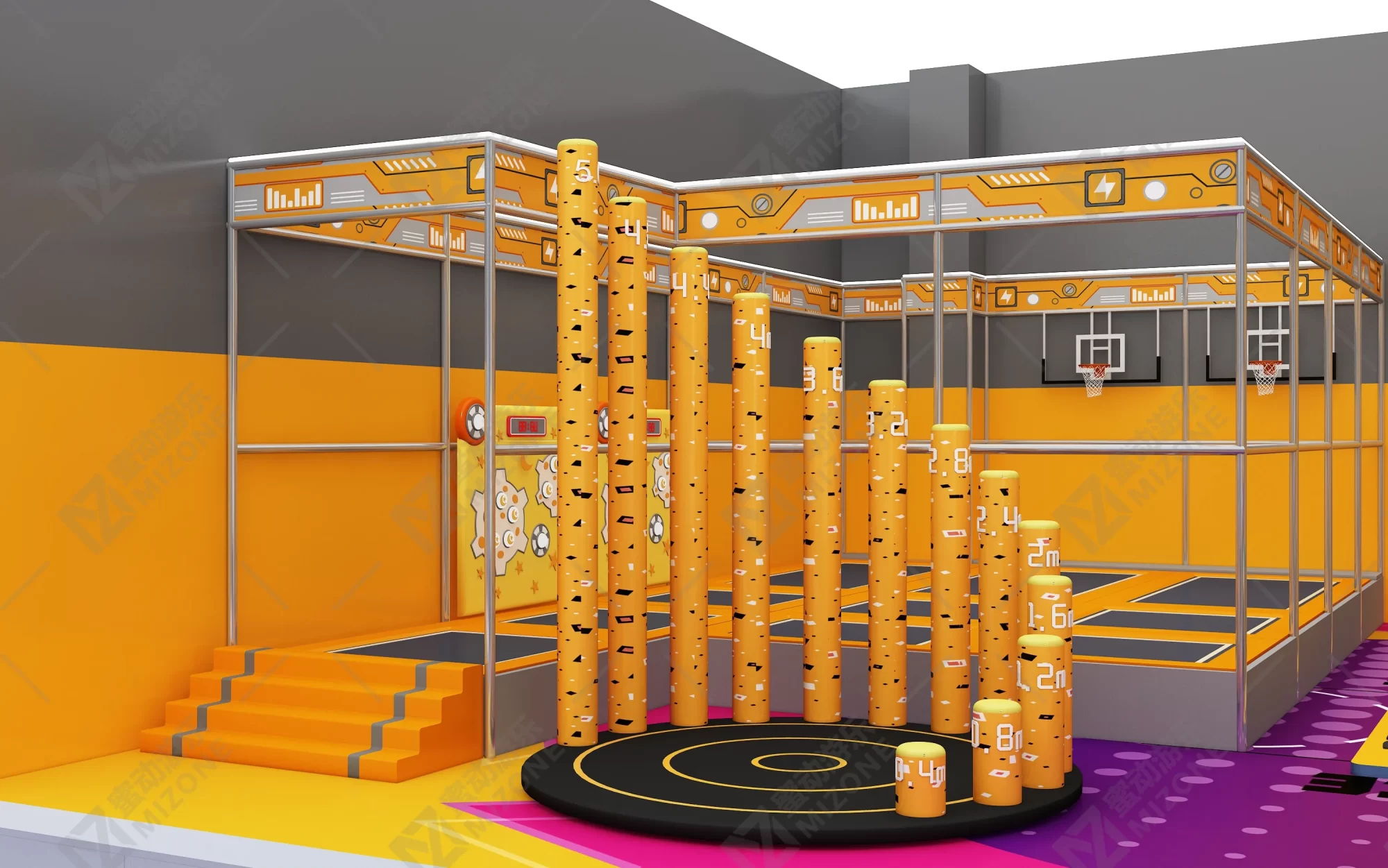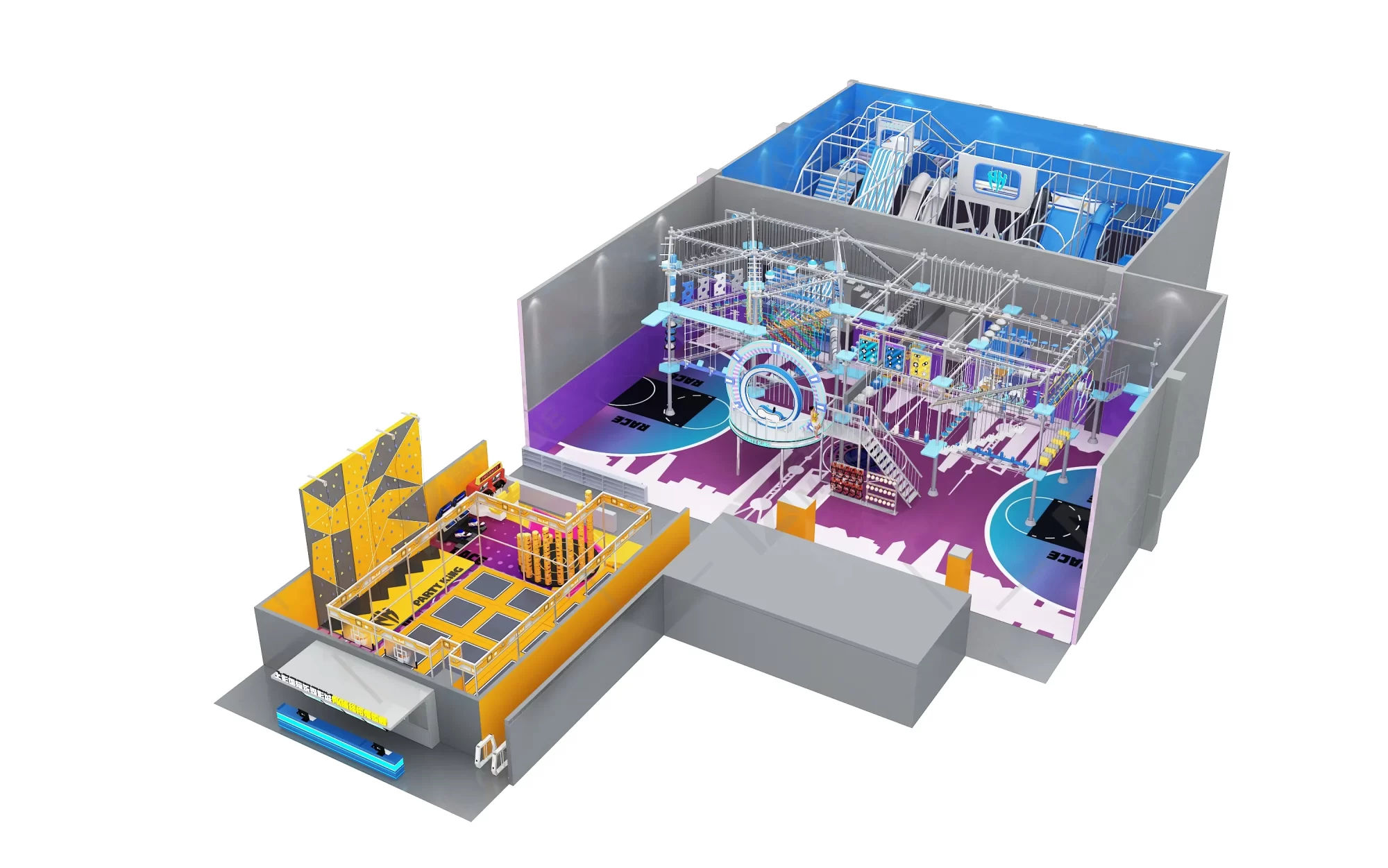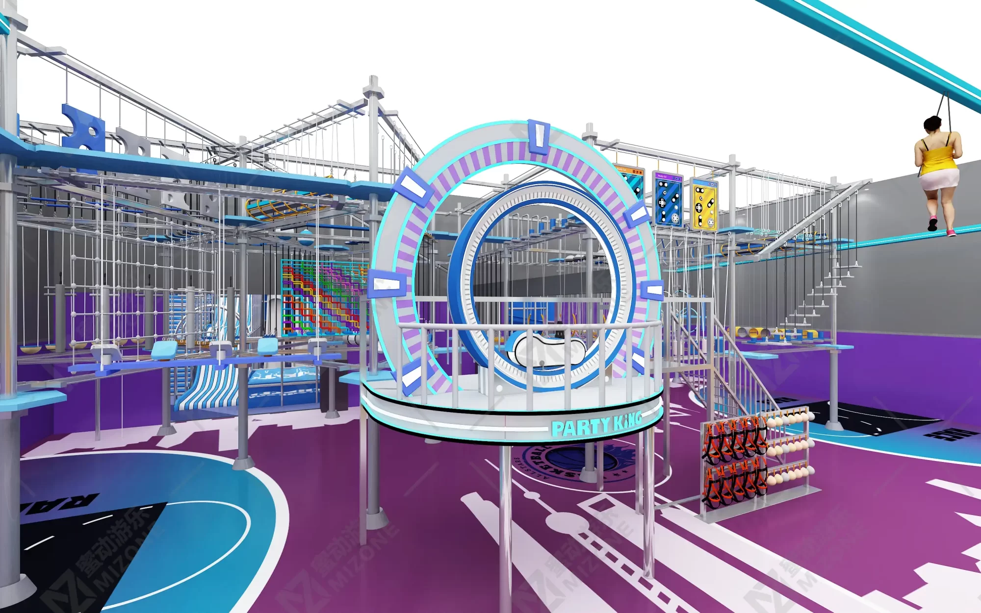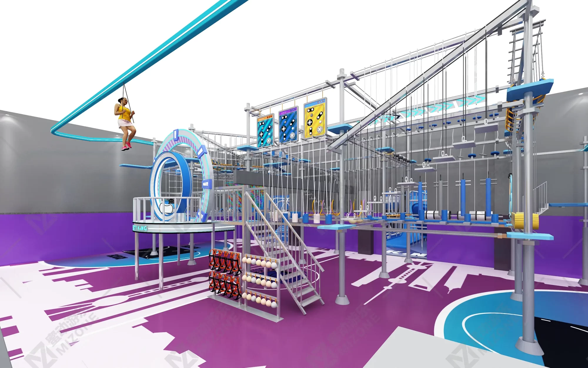 Featured Attractions Include: Rock Climbing, Plum Blossom Piles, Trampoline Zone, Adventure Expansion Area, Elevated 360° Bicycle, Slide Matrix.